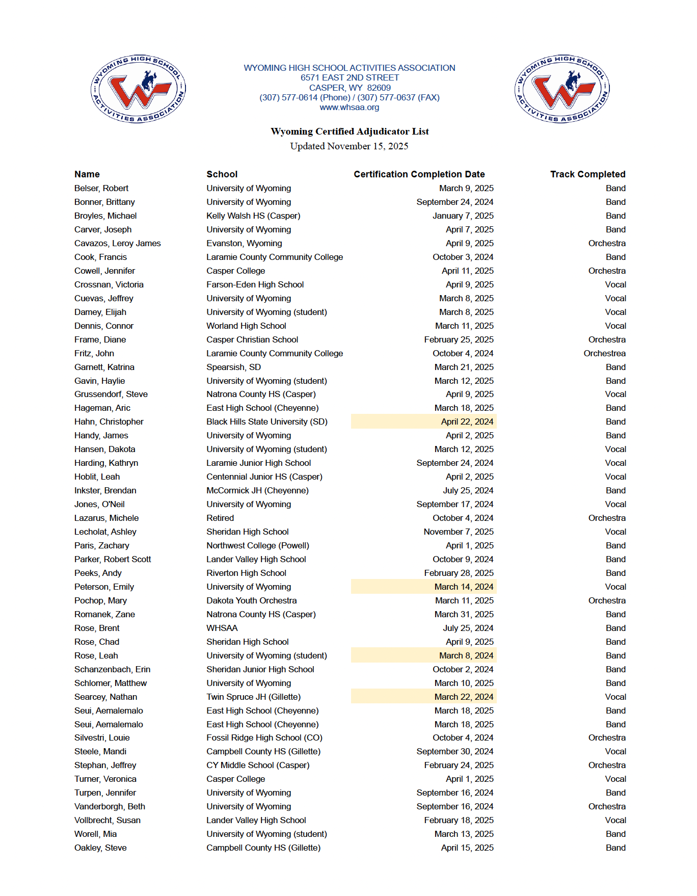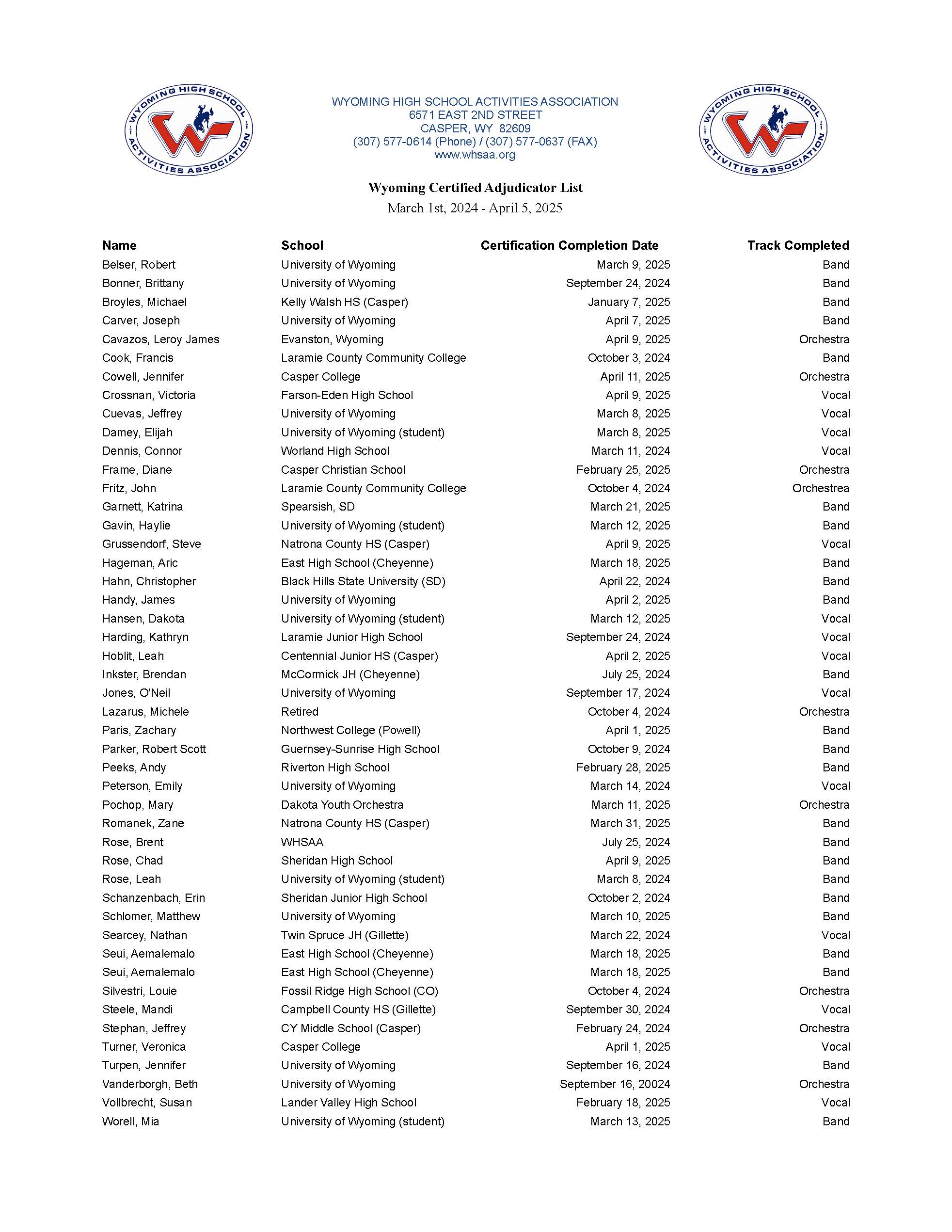 WHSAA requires annual training through the NFHS Introduction to Music Adjudication, for any individuals interested in certifying to adjudicate at district music festivals in the State of Wyoming.